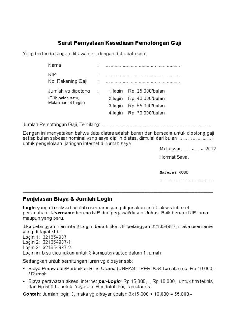 • 0 likes • 7,367 views. Draf surat kuasa untuk melakukan pemotongan gaji karyawan. Surat perjanjian potong gaji pdf. Surat pernyataan gaji dan upah. Contoh surat edaran pemotongan gaji . Surat pemberitahuan ini disampaikan kepada karyawan.